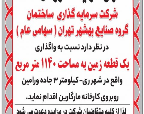 شرکت سرمایهگذاری ساختمان گروه صنایع بهشهر تهران (سهامی عام)، در نظر دارد ۳ دستگاه خودرو ( پژو پارس با سال ساخت ۱۳۹۷ ، ۱۳۹۸ و ۱۳۹۹ ) را از طریق مزایده به فروش برساند ، لذا از کلیه متقاضیان دعوت میشود جهت کسب اطلاعات بیشتر به آدرس ذیل و سایت شرکت مراجعه نمایند .